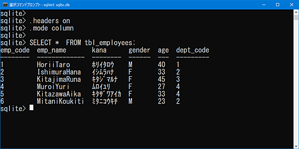 SELECT * FROM tbl_employees;*「.headers」「.mode」は表示内容の設定コマンドなので、ログイン後に1回実行すればOKです。