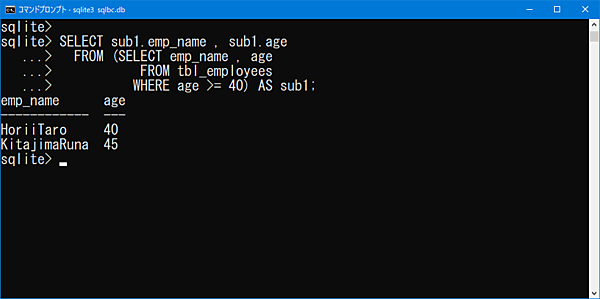 WHERE age >= 40) AS sub1;社員テーブルの年齢が40以上のデータを取得していることが確認できます。