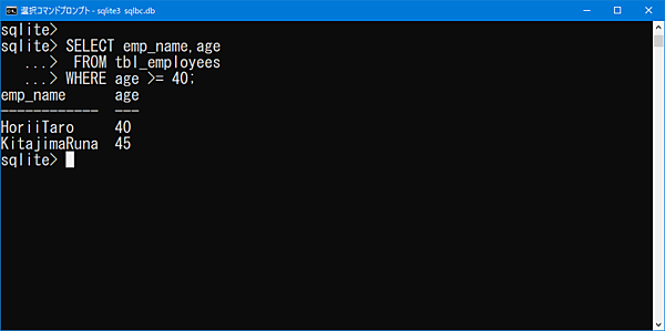 WHERE age >= 40;上図のコマンドでは、社員テーブルの年齢が40以上のデータから、氏名、年齢の2項目のみ取得するよう定義しています。先ほどのサブクエリと同様の内容となります。