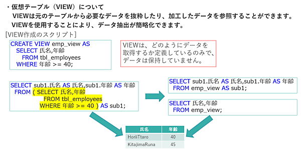ビューは元のテーブルから必要なデータを抜粋や加工して取得し、仮想テーブルとして使用できます。また、どのようにデータを取得するかを定義しているのみなので、データ自体は保持していません。そのため、ビューにINSERT、UPDATE、DELETEはできないので注意してください。