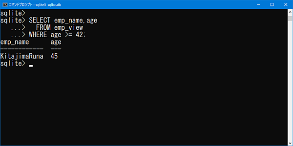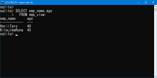 FROM emp_view;結果はサブクエリの場合と同じになりますが、記述するSELECT文は簡略化されています。このように、ビューは「age >= 40」のように、同じ条件のデータを使いまわす場合はとても便利ですが、条件が都度変更になる場合等は、サブクエリの利用を検討しましょう。