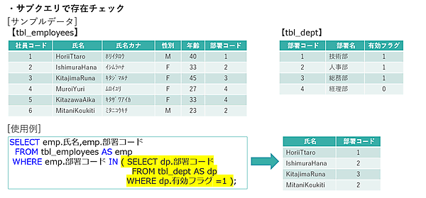 使用例は、社員テーブルの部署コードが、部署テーブルの有効フラグ = 1(有効) の部署コードと同じ社員テーブルのデータを抽出していますので、結果を確認してみましょう。