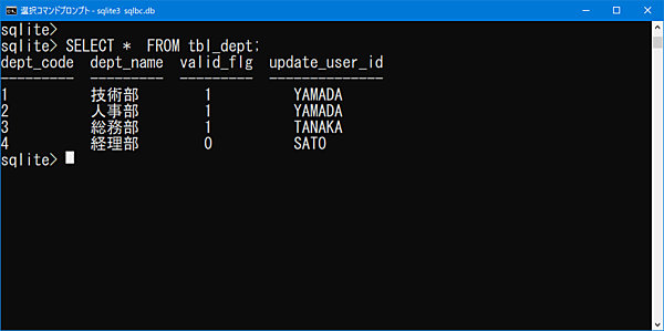 , ('3','総務部','1','TANAKA'), ('4','経理部','0','SATO');作成した部署テーブルの内容を確認してみましょう。
