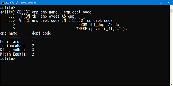 WHERE dp.valid_flg = 1 );社員テーブルの部署コードが、部署テーブルの有効フラグ = 1(有効) となっている部署コードと同じデータが抽出されていることを確認できます。IN句でサブクエリの結果に存在チェックを行い、存在する場合に抽出対象となっています。