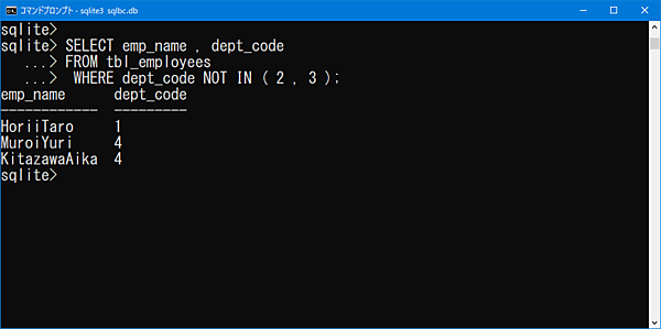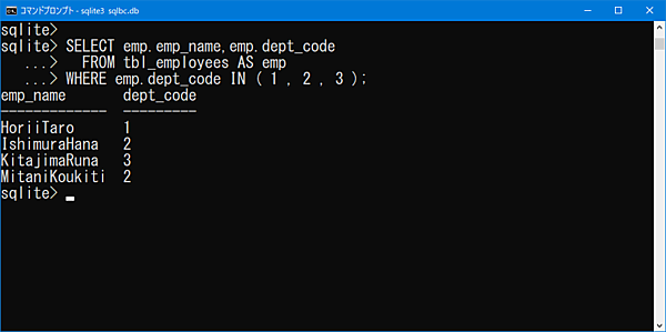 WHERE句を「dept_code = 2 OR dept_code = 3」と記述した場合と同じ結果ですが、IN句を使用するとシンプルに記述できます。