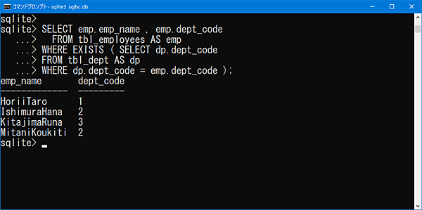 先ほど部署テーブルから削除した部署コード = 4 の社員テーブルのデータは、EXISTS句でのチェック結果がFALSEになるため表示されていないことが確認できます。