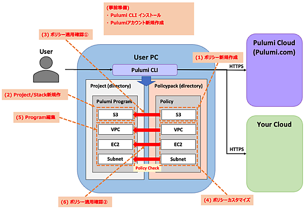 今回のハンズオンの流れと関連するサービス/リソースの全体像は以下のとおりです。ハンズオン実施前には「事前準備」を行います(後述)。最初はPulumi公式HP記載の手順に沿う形ですが、後半はポリシー設定をカスタマイズしてポリシーチェックの様子を確認します。ポリシーおよびPulumi ProgramはPythonで作成し、AWSリソースをデプロイしていきます。