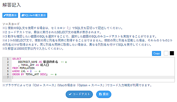 解答を記入後、「コードテスト」ボタンを押下して結果を確認します。