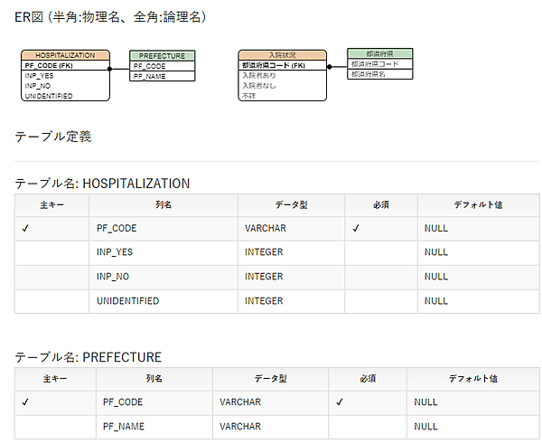 ER図を見ると入院状況テーブルと都道府県テーブルが実線で繋がれているため、2つのテーブルは依存型リレーションであることを確認できます。入院状況テーブルの都道府県コードが(FK)外部キーとなっているので、都道府県テーブルが親で入院状況テーブルが子という親子関係となります。子テーブルの都道府県コードが親テーブルの都道府県コードの存在に依存していることがわかります。