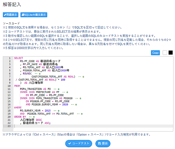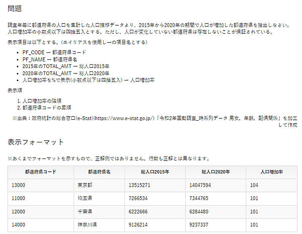 難易度3となるこの問題は、先の問題と同様にテーブル結合を利用しますが、同じテーブルを結合(自己結合)して、調査年毎に総人口を取得しています。