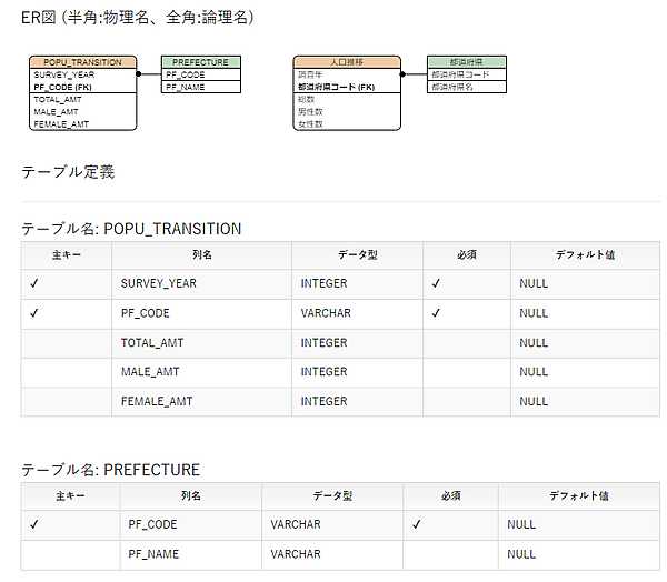 ⑤もう1つの内部結合で、メインテーブルと同じ人口推移テーブルを結合して調査年が2020年のデータを取得しています。どちらのテーブルの項目か判断できるように、AS句を使用して違う名称にしています