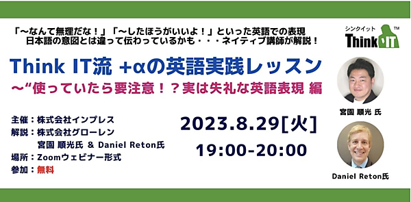 「Think IT (シンクイット)」が主催する主に読者のエンジニア層を対象とした英語実践セミナー「Think IT流 +αの英語実践レッスン」では、英語シリーズの第6弾としてついつい言ってしまいがちな表現を取り上げてネイティブ講師が解説する「ここが変だよ! 日本人の英語! やりなおしの英語実践レッスン特別版~使っていたら要注意! 実は失礼な英語表現編」を8月29日(火)にオンライン開催します。