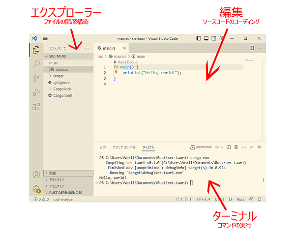 PS C:¥Users¥Vexil¥Documents¥Rust¥src-tauri > cargo run Compiling src-tauri v0.1.0 (C:¥Users¥Vexil¥Documents¥Rust¥src-tauri) Finished dev [unoptimized + debuginfo] target(s) in 0.92s Running `target¥debug¥src-tauri.exe` Hello, world! - この他にもリリースビルドするには、次のコマンドを使います。