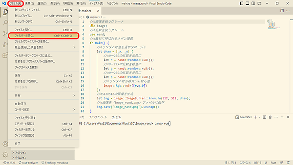 - まず「ドキュメント」フォルダーなどに「Rust」というフォルダーを作成します。Visual Studio Codeを起動して図14のように「ファイル」→「フォルダーを開く」メニューを実行し、ファイルダイアログで作成した「Rust」フォルダーを選び[フォルダーを選択]ボタンをクリックします。すると、開いたフォルダーがカレントディレクトリになります。