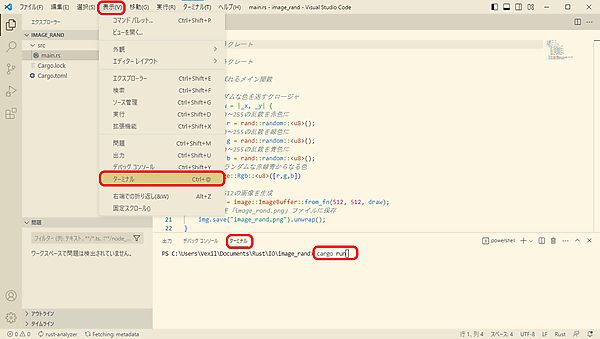 - 「ターミナル」ペインで「cargo」などのコマンドを実行します。