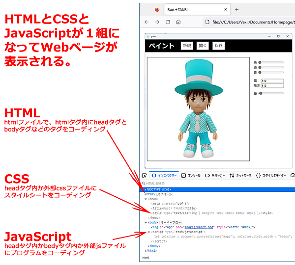なお、TAURIのフロントエンドはWebページと同じHTML5+CSS+JavaScriptで作るため、まずそれらについて簡単に解説します。Webページの仕組みは図2のようになっています。