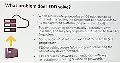 ここではIoTデバイスが工場からリセラー経由で家庭に届くという想定のもと、現状のシステムでは設定に手間がかかる、デフォルトのユーザーネーム/パスワードのままでは安全ではない、メーカーごとに違う認証システムを使っているなどの欠点を挙げて説明。その上でFIDO Allianceが推進するFIDO Device Onboard(FDO)を解説した。