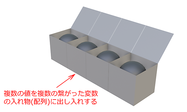 配列とは、複数の変数をまとめて保持する入れ物のようなものです(図2)。同じデータ型の変数がたくさんある場合に一度に処理するのに役立ちます。