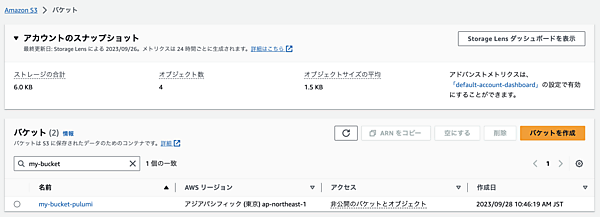 Pulumi管理化のリソース(S3 Bucket)をあらかじめ手動で作成します。今回のハンズオンではAWSリージョン「ap-northeast-1」の「my-bucket-pulumi」という名前でS3 Bucketを作成しました。