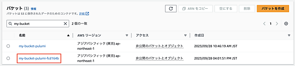 $ pulumi stack export { "version": 3, "deployment": { "manifest": { "time": "2023-09-28T16:01:51.629695+09:00", "magic": "1fce246d436c6e46d168db13ed1014131c96be0ccf8401639052718fba57ac37", "version": "v3.72.2" }, "secrets_providers": { "type": "service", "state": { "url": "https://api.pulumi.com", "owner": "***", "project": "pulumi-import", "stack": "dev" } }, "resources": [ { "urn": "urn:pulumi:dev::pulumi-import::pulumi:pulumi:Stack::pulumi-import-dev", "custom": false, "type": "pulumi:pulumi:Stack", "outputs": { "bucket_name": "my-bucket-pulumi-fcd164b" }, "created": "2023-09-28T07:01:47.453547Z", "modified": "2023-09-28T07:01:47.453547Z" }, { "urn": "urn:pulumi:dev::pulumi-import::pulumi:providers:aws::default_6_2_1", "custom": true, "id": "69044939-2182-498b-9919-b3a529f1ce10", "type": "pulumi:providers:aws", "inputs": { "region": "ap-northeast-1", "skipCredentialsValidation": "false", "skipMetadataApiCheck": "true", "skipRegionValidation": "true", "version": "6.2.1" }, "outputs": { "region": "ap-northeast-1", "skipCredentialsValidation": "false", "skipMetadataApiCheck": "true", "skipRegionValidation": "true", "version": "6.2.1" }, "created": "2023-09-28T07:01:49.057079Z", "modified": "2023-09-28T07:01:49.057079Z" }, { "urn": "urn:pulumi:dev::pulumi-import::aws:s3/bucket:Bucket::my-bucket-pulumi", "custom": true, "id": "my-bucket-pulumi-fcd164b", "type": "aws:s3/bucket:Bucket", "inputs": { "__defaults": [ "acl", "bucket", "forceDestroy" ], "acl": "private", "bucket": "my-bucket-pulumi-fcd164b", "forceDestroy": false }, "outputs": { "accelerationStatus": "", "acl": "private", "arn": "arn:aws:s3:::my-bucket-pulumi-fcd164b", "bucket": "my-bucket-pulumi-fcd164b", "bucketDomainName": "my-bucket-pulumi-fcd164b.s3.amazonaws.com", "bucketRegionalDomainName": "my-bucket-pulumi-fcd164b.s3.ap-northeast-1.amazonaws.com", "corsRules": [], "forceDestroy": false, "grants": [], "hostedZoneId": "Z2M4EHUR26P7ZW", "id": "my-bucket-pulumi-fcd164b", "lifecycleRules": [], "loggings": [], "objectLockConfiguration": null, "region": "ap-northeast-1", "replicationConfiguration": null, "requestPayer": "BucketOwner", "serverSideEncryptionConfiguration": { "rule": { "applyServerSideEncryptionByDefault": { "kmsMasterKeyId": "", "sseAlgorithm": "AES256" }, "bucketKeyEnabled": false } }, "versioning": { "enabled": false, "mfaDelete": false }, "website": null }, "parent": "urn:pulumi:dev::pulumi-import::pulumi:pulumi:Stack::pulumi-import-dev", "provider": "urn:pulumi:dev::pulumi-import::pulumi:providers:aws::default_6_2_1::69044939-2182-498b-9919-b3a529f1ce10", "additionalSecretOutputs": [ "tagsAll" ], "created": "2023-09-28T07:01:51.619949Z", "modified": "2023-09-28T07:01:51.619949Z" } ] } } - ここで一度作成されたbucketを削除して、元に状態に戻します。