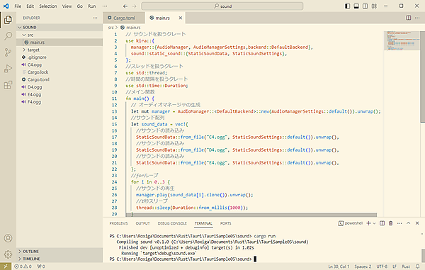 次のサンプルコードのように「src」→「main.rs」ファイルでkiraクレートを使ってサウンドを再生してみましょう。「cargo run」すれば下図のように「ドレミ」の音が再生されます。本来なら何行もコードを書かなければならないところ、kiraクレートを使えば20行にも満たないコードでサウンドを読み込んで再生できます。