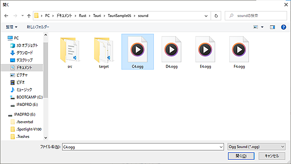 今度は自分で開くファイルを選んでからサウンドを再生します(図4)。ファイルダイアログは開くファイルのパス名を取得するだけで、実際にパス名のファイルを開くのはkiraクレートの役割です。