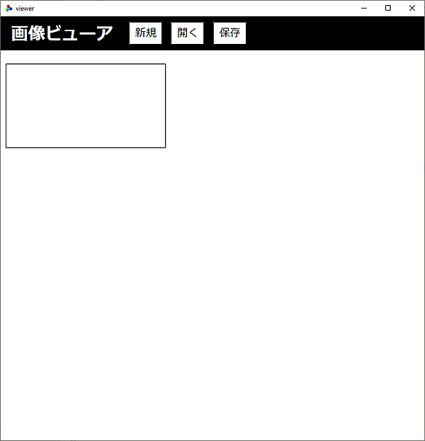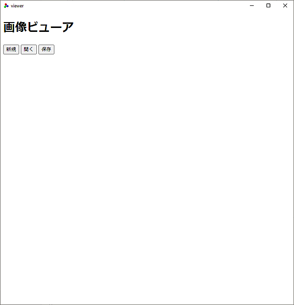 今回完成させる画像ビューアは、図1のように「タイトル」「新規ボタン」「開くボタン」「保存ボタン」「画像ビュー」だけがあるWebページです。画像ファイルを読み込んだり書き出したりするにはバックエンドのRustの「image」クレートを使います。