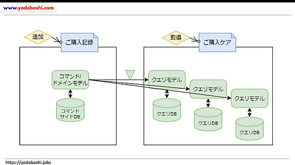 例えば、利用者が商品を購入すると、コマンドのドメインモデルにデータがストアされる。その後、利用者への提案にあたるクエリモデルが生成される。これを適切なタイミングで利用者に提示することで、ヨドバシ店員に相談するかのように、商品のレコメンドができる。このような接客体験を、API上でも実現したいと、戸田氏は言う。