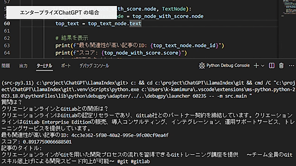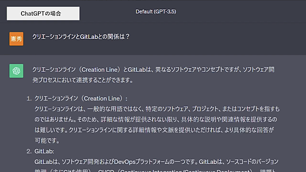 荒井氏はRAGのデモとして、本来ChatGPTが知るはずがない情報への問い合わせに回答させるデモを行った。質問は「クリエーションラインとGitLabの関係は?」だ。期待される答えは「クリエーションラインがGitLabのパートナー企業でありリセラーである」というものだ。まず通常のChatGPTに回答させたところ、ChatGPTはクリエーションラインについて学習していないため、正しく回答できなかった。次に、RAGにクリエーションライン技術ブログのデータを読み込ませ、API経由でChatGPTに回答させたところ正しく回答ができた。質問の意味を汲み取って回答するLLMの強みと、RAGにより正しいデータに基づいて回答することを両立することで、いわば「エンタープライズChatGPT」を実現できる。