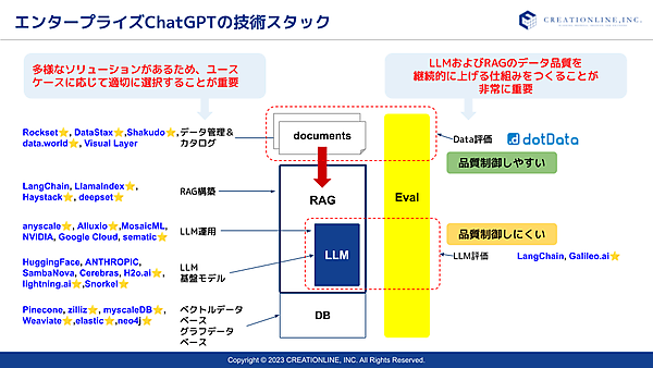 エンタープライズChatGPTを実現するには、LLMやRAGへの継続的なデータ供給のためのインフラ整備が重要となる。また、生成AIの課題である幻覚症状を抑えることも重要となる。多様なソリューションが登場する中で、企業のユースケースに最適なものを選択することが必要だと、荒井氏は言う。