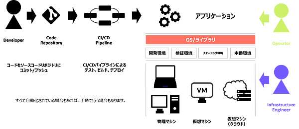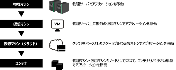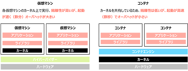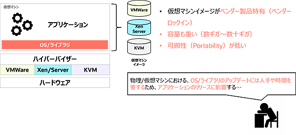 仮想マシンにおいては、仮想マシンイメージが各ベンダー製品特有のものであったり、容量が重く、可搬性が低いことによる運用への影響もあります。例えば、OS/ライブラリのアップデートに人手や時間を要することでアプリケーションのリリースに影響する、などです。