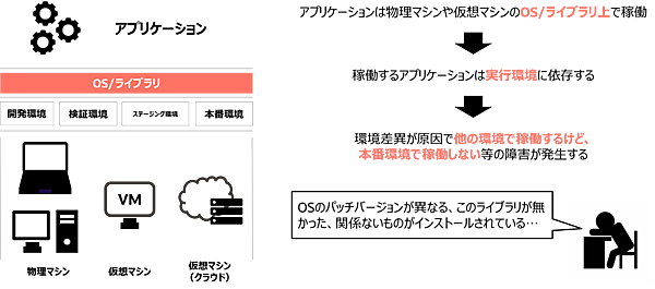 アプリケーションは、物理や仮想マシンのOSやライブラリ上で稼働します。その稼働するアプリケーションは実行環境に依存するため、環境差異が原因で他の環境では稼働するが、本番環境では稼働しないなどの障害が発生する可能性があります。例えば、OS やパッチのバージョンが異なる、このライブラリがなかった、関係ないものがインストールされている、などです。