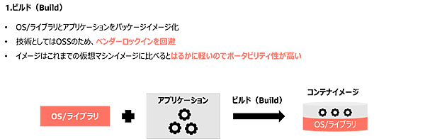 ここからは、コンテナの基本となるBuild/Ship/Runについて説明します。仮想マシンと同様にコンテナにもイメージがあります。このイメージをプロセス空間(コンテナ)に展開して動かします。このイメージにはOS/ライブラリとアプリケーションが含まれています。ビルド処理を行い、コンテナイメージとしてパッケージされます。