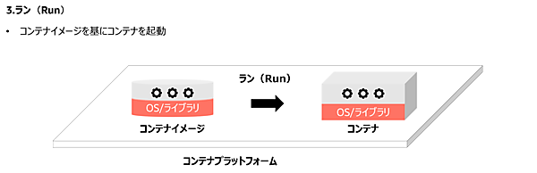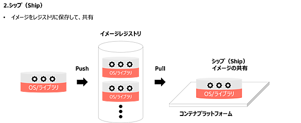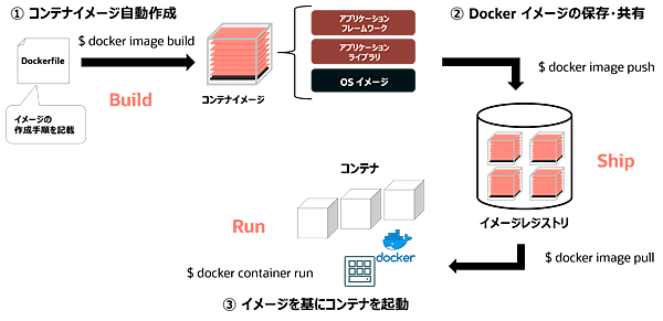 Build/Ship/Runを整理すると、Dockerfileでコンテナイメージを作成、生成されたコンテナイメージをコンテナイメージレジストリに格納し、そこで保存および共有、コンテナプラットフォーム上でコンテナ起動という流れになります。