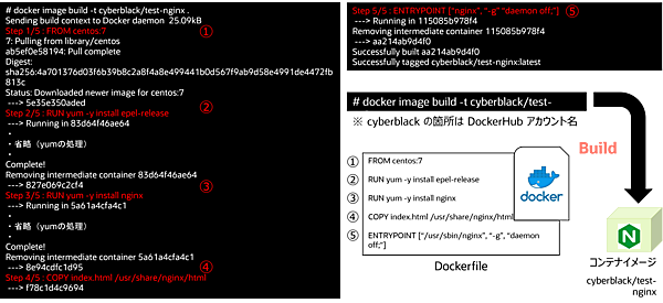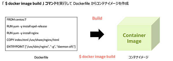 コンテナイメージの作成にはDockerfileを利用します。下図のDockerfileはCentOS7上にNginxを起動する例です。手順としては、CentOS上にNginxをインストールするのと同じです。「COPY index.html /usr/share/nginx/html」の箇所は、ビルド時にローカルにある index.htmlを/usr/share/nginx/htmlディレクトリにコピーするということです。そして「ENTRYPOINT ["/usr/sbin/nginx", "-g", "daemon off;"]」は、コンテナ起動時にNginxのプロセスを起動するということです。