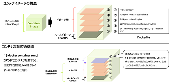 ここで、コンテナイメージの構造とコンテナ起動時の構造を見ていきます。コンテナイメージは、Dockerfileの命令に従ってレイヤーを形成する構造です(下図)。ベースイメージがCentOS7のレイヤーとなり、その上に各命令の内容が積み重なる仕組みです。ベースイメージの容量やレイヤー数が多くなるとコンテナイメージの全体の容量にも影響が出るため、軽量化を考慮する必要があります。コンテナイメージの軽量化については多種多様なナレッジがあるためここでは説明を省きますが、インターネット上にはたくさんあるので調べることをお勧めします。