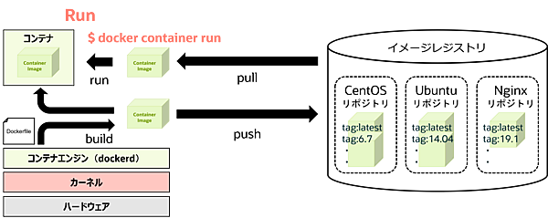 ローカルでビルドしたコンテナイメージやコンテナレジストリからプルしたコンテナイメージを基に「docker container run」コマンドを実行して、コンテナを起動します。