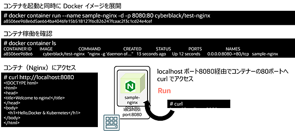 下図はコンテナを起動して、curlコマンドでNginxのデフォルト画面を表示する例です。