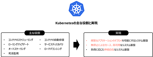 Kubernetesは、コンテナ単体ではできないことを担います。下図にKubernetesの主な役割と実現できることを示します。