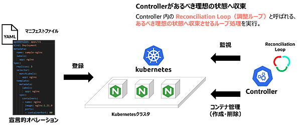 Kubernetesには、宣言的オペレーションとしてマニフェストに定義した内容を、内部コンポーネントのコントローラーがあるべき理想の状態と認識し、その状態を維持および変化があった場合に定義状態に収束するReconciliation Loop(調整ループ)という仕組みがあります。この仕組みについては、後半で説明します。