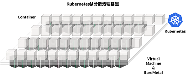 Kubernetesは、分散処理基盤と考えるとイメージが湧きやすいかと思います。たくさんのサーバをクラスタとして束ねて、その上でコンテナとしてアプリケーションを稼働します。