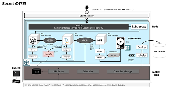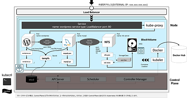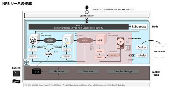 ブロックボリュームをストレージとするNFSサーバを構築し、WordPressとMySQLからのデータを保存できるようにします。そして、ブラウザから外部接続してWordPressを利用できるようにします。その際、これまで学んできたDeployment、Service、PersisitentVolume、PersistentVolumeClaim、Secretを利用して環境を構築します。