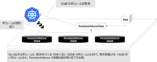 事前にストレージを準備して、そのストレージをPersistentVolumeに紐づけます。そして、そのPersistentVolumeをPersistentVolumeClaim を利用して要求します。下図では5GiBを要求しています。実際、払い出されるボリュームは要求されている5GiBに近い20GiBのボリュームとなります。要求容量よりも15GiB多いボリュームとなるので PersistentVolumeの容量は設計時に考慮が必要です。