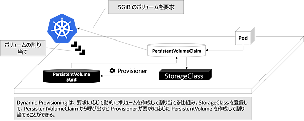 PersistentVolumeClaimが発行されたタイミングで、動的にPersistentVolumeをプロビジョニングできるStorageClassという機能があります。デモ環境のPersistentVolumeとブロックボリュームの作成も、この機能を利用しています。