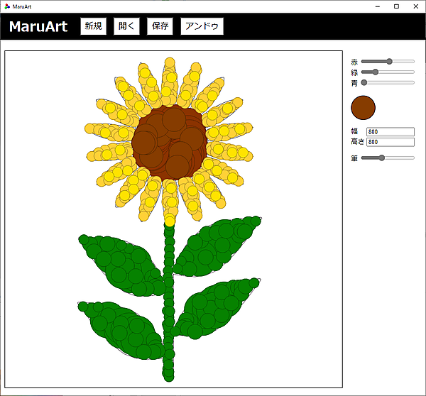 図1のように色の付いた正円を好きな太さで何個も判子のように押していけば、例えばヒマワリの丸シールアートが描けます。よく見ていただければ分かるように、塗り絵のように線画の下絵を読み込んでから描いています。あまり上手な絵は描けませんが、これなら誰でも簡単に描けてヘタウマな感じがしませんか。