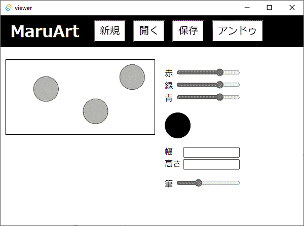 今回は「HTML5+JavaScript+CSS」だけコーディングし、「canvas」タグに円を描けるようにしたり、円の赤緑青の色をスライダーで変更させられるようにしたり、円のペン(筆)の太さを変更させられるようにしたり、canvasタグの幅高さの大きさを変更できるようにしたりします。「Rust」については前回のまま同じコードで、画像を読み込んだり保存したりするだけです。
