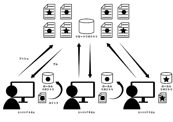 分散型は、集中型のアーキテクチャにローカルリポジトリが増えたようなものになります。ネットワークを介して開発メンバーと変更を共有するためのリポジトリをリモートリポジトリと呼び、開発メンバーごとのローカルマシン上に構築されるのはローカルリポジトリです。分散型でもリモートリポジトリを経由して開発メンバーと変更を共有するため、ネットワークに依存することは変わりません。ただし、ローカルリポジトリがあることで、リモートリポジトリに接続できない状態でもローカルリポジトリとやりとりしてバージョン管理ができます。