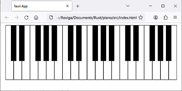 そこで、次の「index.html」「main.js」「styles.css」のコードを書いて、ひとまずWebブラウザで表示してみましょう! …と言いたいところですが、実行エラーで何も表示されません。そこで、いったんJavaScriptからTAURIの部分のコードを削除してWebブラウザで開いてみると、図6のようにピアノのWebページが表示されます(このようなことはすべきではないのですが…)。