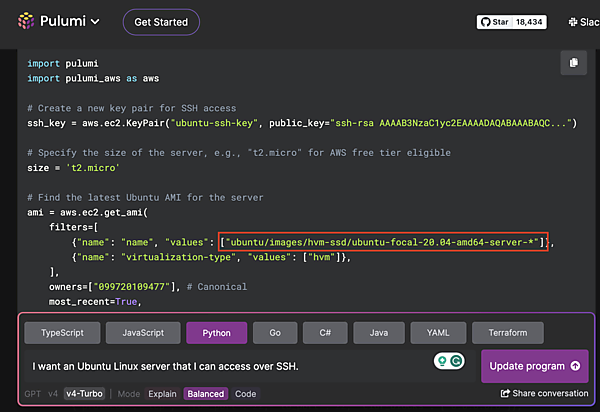 Pulumi AIは、自然言語を使用してPulumiのIaCプログラムを生成するPulumiサービス(SaaS)に組み込まれたAIアシスタント機能で、2023年4月ごろにリリースされました。2023年12月時点で自然言語は英語のみ利用可能ですが、生成したいPulumiプログラムの言語を選択してからリソースの要件を英語で入力すると、即座に要件に沿ったPulumiプログラムが生成されます。