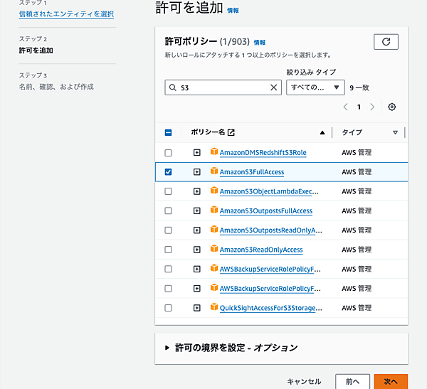 - 「許可を追加」画面では「AmazonS3FullAccess」ポリシーのみを選択した状態で、[次へ]をクリックします。